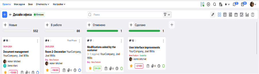 - Доска Kanban: визуальное представление проектов и задач.